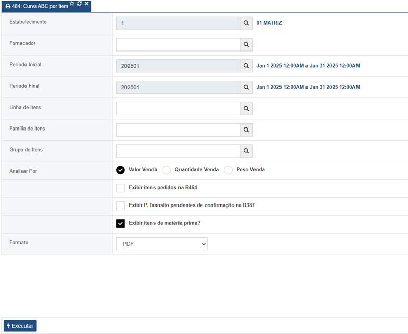 Após a definição dos parâmetros e o reprocessamento para o período desejado, acesse a Rotina de Relatório de Curva ABC por Item - R484 e defina os filtros para emissão do relatório.