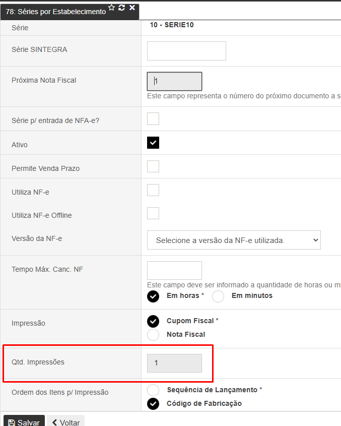 Essa configuração é realizada na rotina R78 – Séries por Estabelecimento, no campo "Qtd. Impressões".