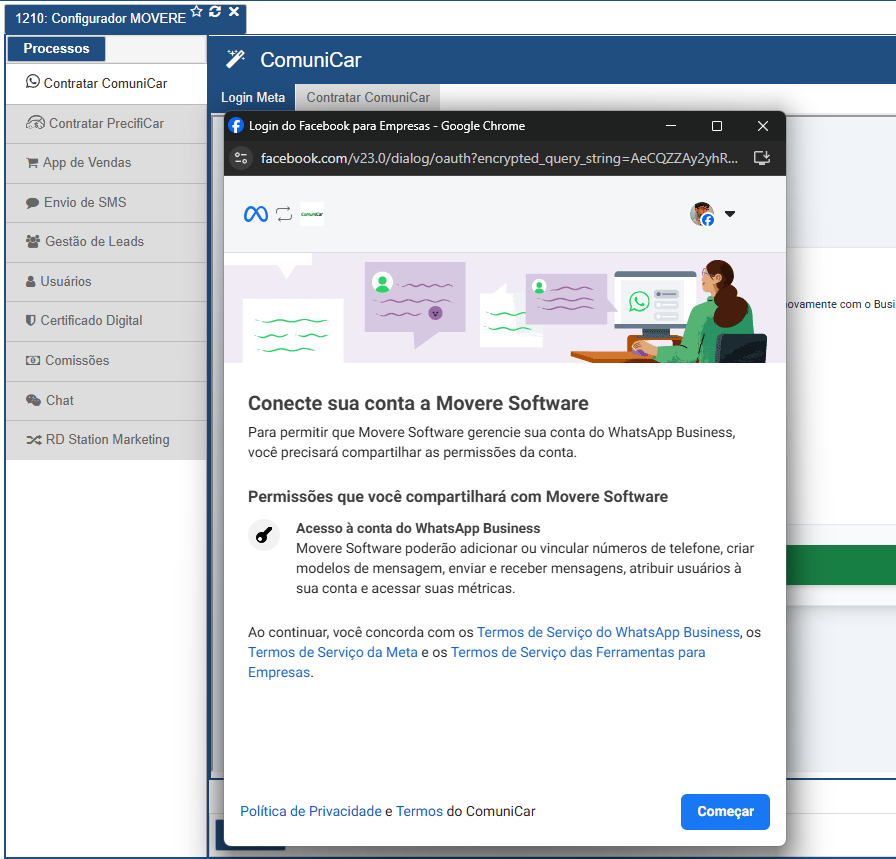 Para cadastrar, clique no botão "Fazer Login", e uma janela para login será aberta. Siga o passo a passo, selecionando o portfólio empresarial e a conta do WhatsApp Business desejados. O ComuniCar considerará apenas um dos números associados a conta para realizar a integração.