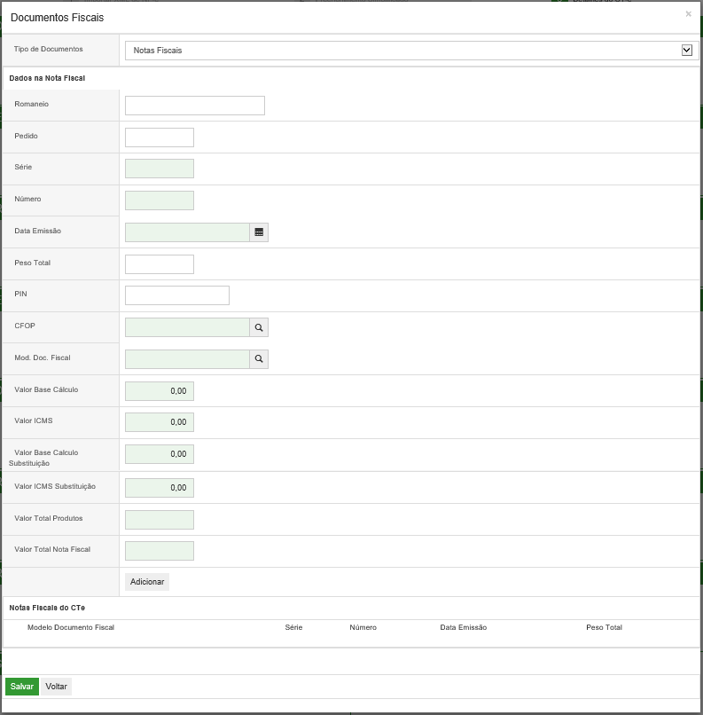 Em Documentos fiscais, é possível informar Notas fiscais Eletrônicas e Notas Fiscais relacionadas ao CT-e.