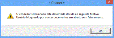 Caso tentem fazer algum procedimento informando o vendedor BLOQUEADO, esta mensagem irá aparecer nas rotinas: