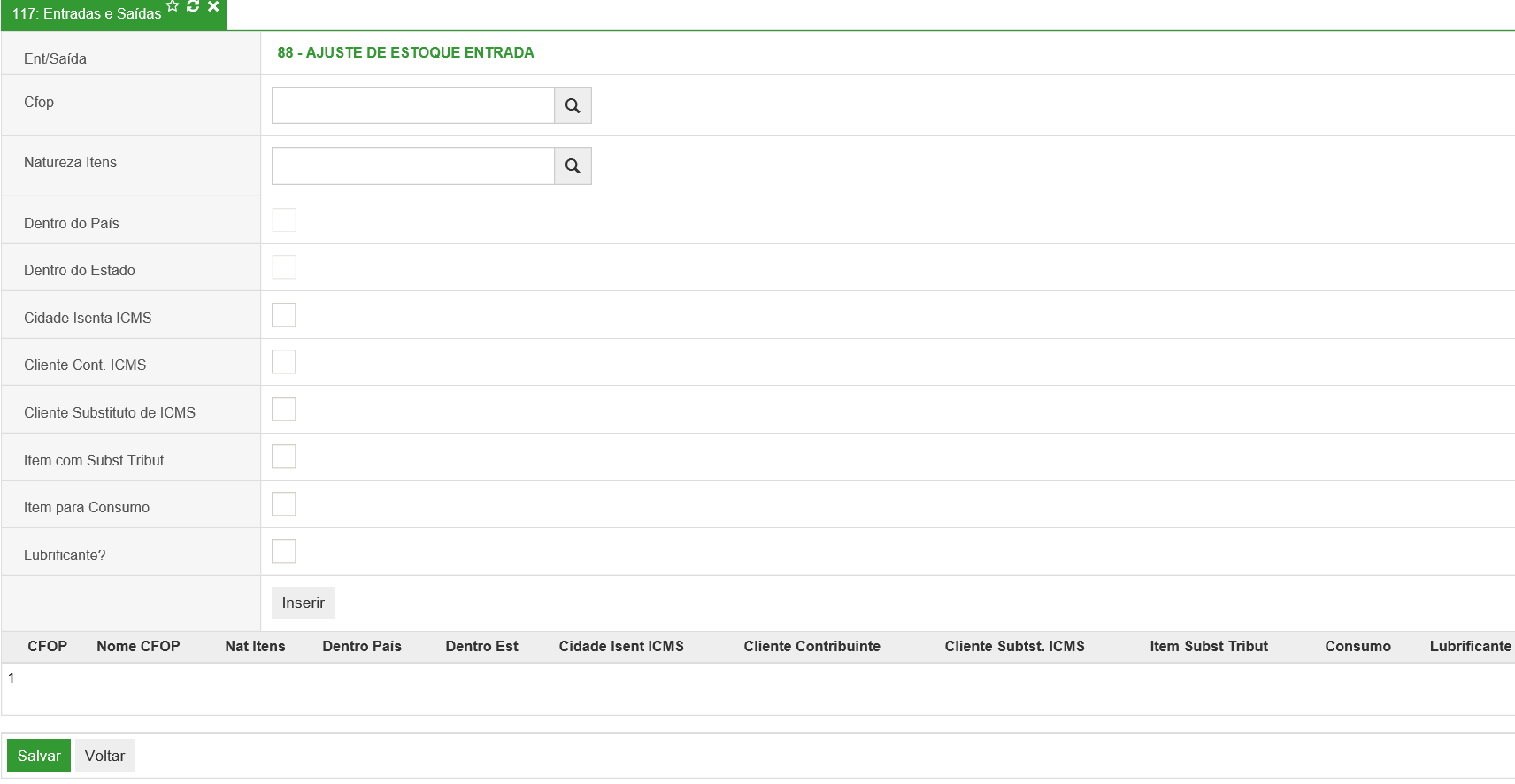 O campo [E/S para Nota Entrada] apenas será exibido quando o campo [Gera Nota de Entrada] estiver marcado: