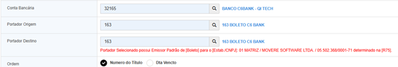 Na [R215] na geração da remessa bancária, quando selecionado o Portador de Destino, existindo a configuração [R75], com o preenchimento do portador a informação de que para o portador selecionado existe um portador padrão para emissão de boleto e remessa bancária.