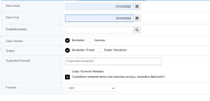 Caso o campo seja marcado, será gerado o relatório contendo as vendas somente dos itens das notas que sejam serviço, revenda ou matéria prima para totalização dos valores.