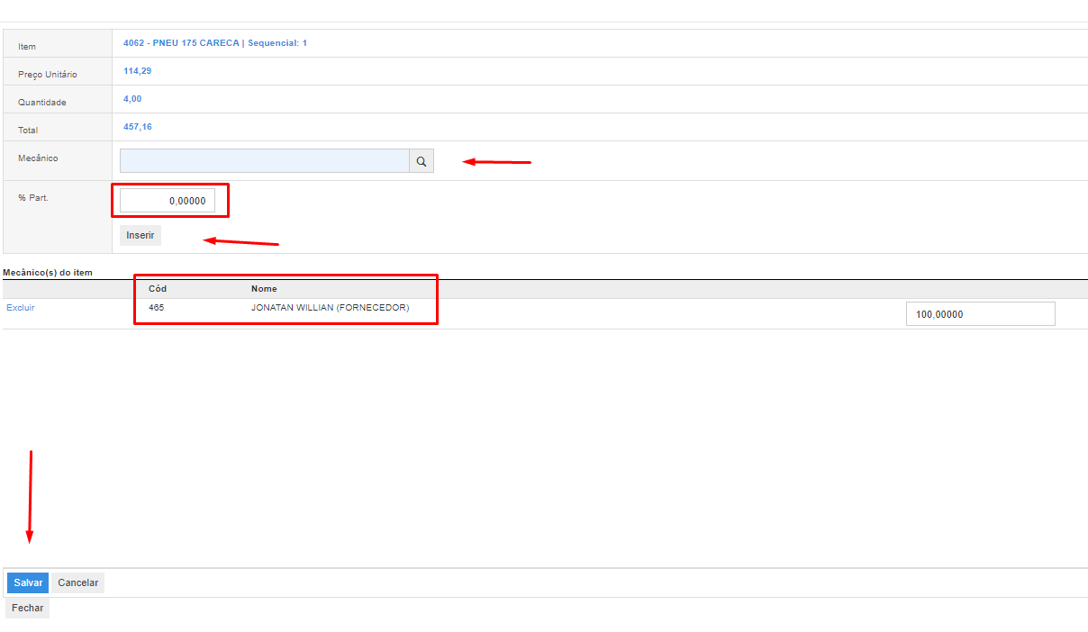 Na tela seguinte, é possível identificar as informações do item que está sendo alterado, no campo mecânico será onde o usuário realizará a inserção do vendedor 3 e no campo % Part. serão definidos os percentuais de participação na venda de cada mecânico, conforme informado anteriormente quando o parâmetro 542 estiver configurado será possível informar mais de um mecânico por item na venda, caso o usurário insira algum código de mecânico indevidamente poderá exclui-lo através da opção "excluir", após finalizar as alterações de um clique no direito salvar.
