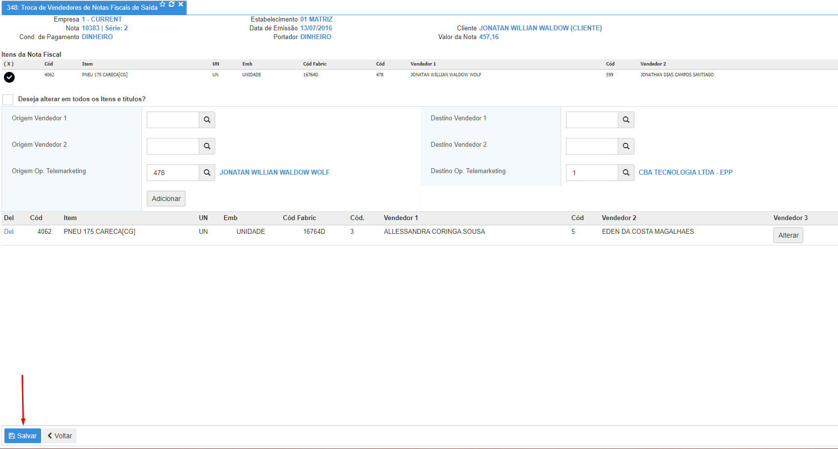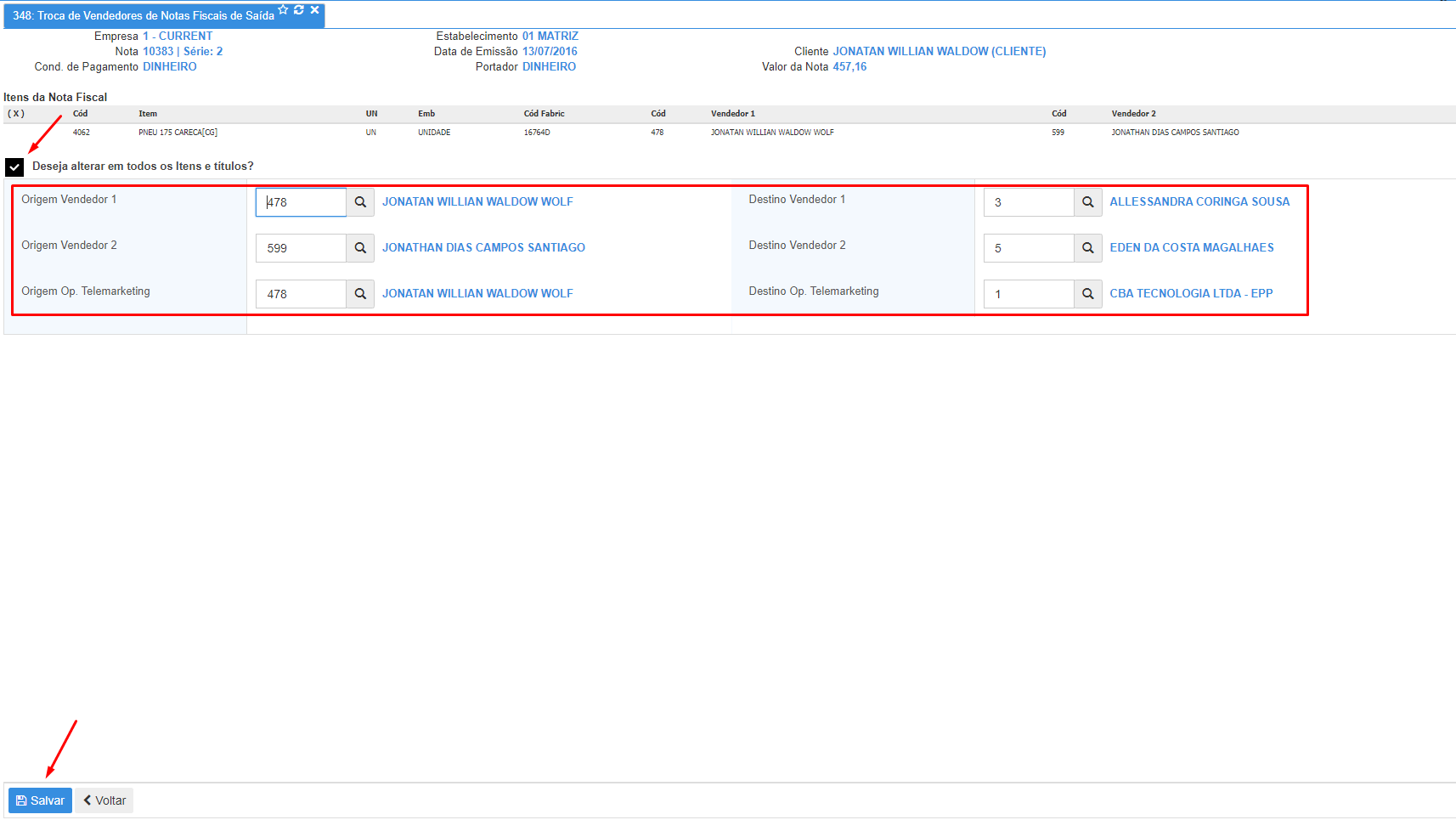 Ao marcar a opção Deseja alterar todos os Itens e títulos? o sistema realizará a troca dos vendedores 1 e 2 mais o Operador de Pré-venda de todos os itens e títulos da nota fiscal. Após realizar a alteração conforme desejado, clique no direito salvar para efetivar a operação.