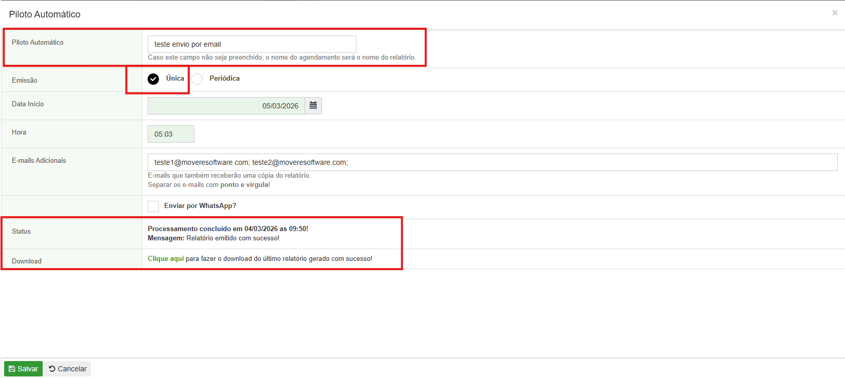 Caso você tenha configurado para receber o relatório várias vezes, você poderá optar pelas seguintes opções: