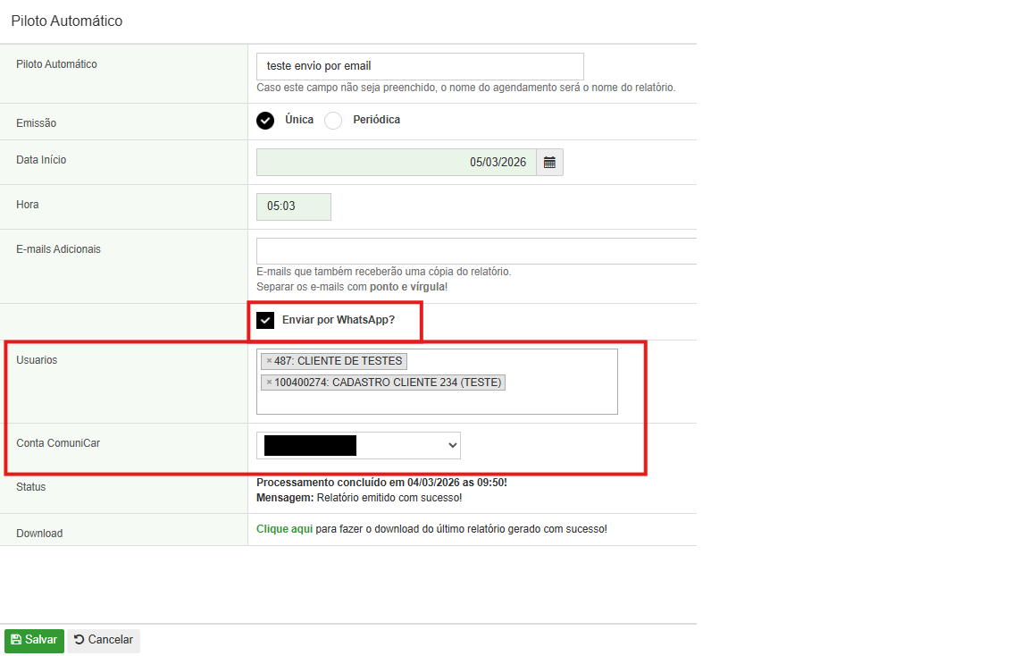 Para realizar o envio do relatório pelo ComuniCar, é necessário ativar a opção "Enviar por WhatsApp".