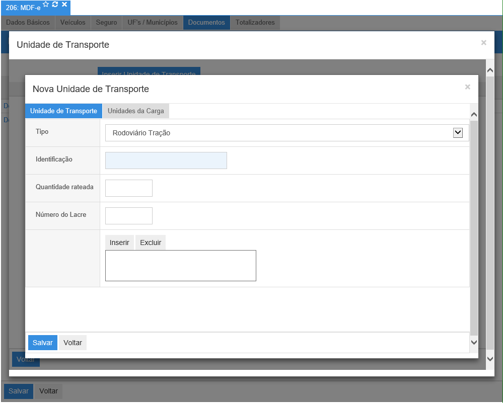 Após inserido Unidade De Transporte basta clicar no botão [Voltar] que o link [Unidades] vai ser atualizado com a quantidade unidade inserido