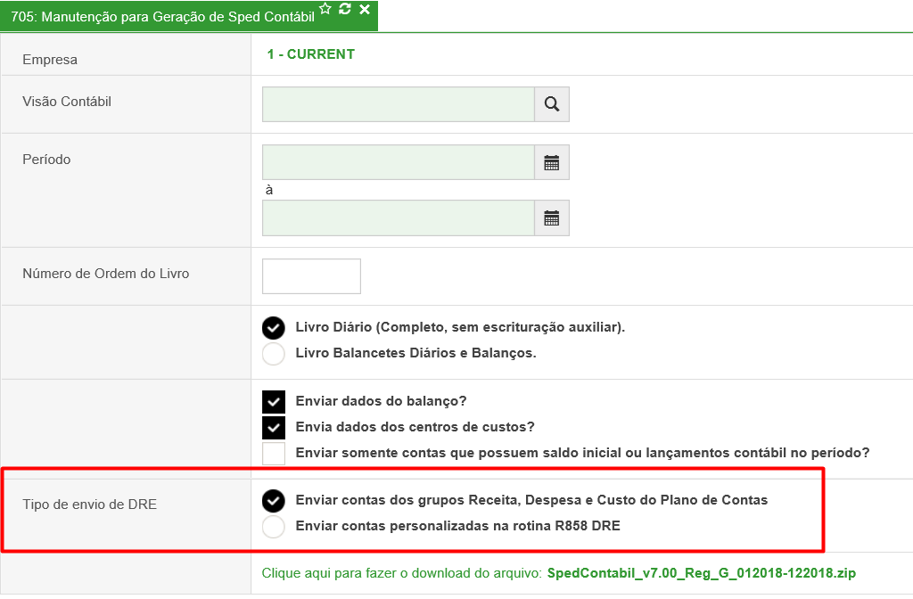 No momento da geração do Sped você pode optar entre as duas opções na rotina [R705 - Manutenção para Geração do Sped Contábil], conforme imagem abaixo: