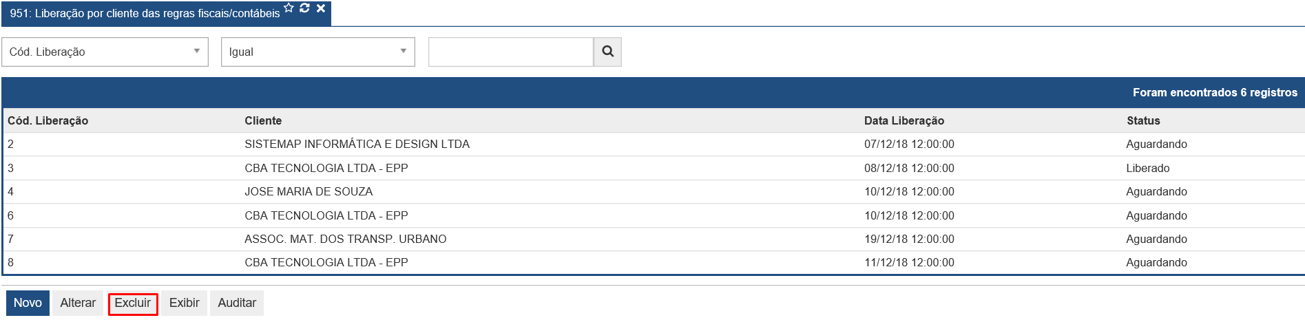 Na janela principal ao clicar em um registro e clicar em excluir, aquela Liberação por Cliente é excluída.