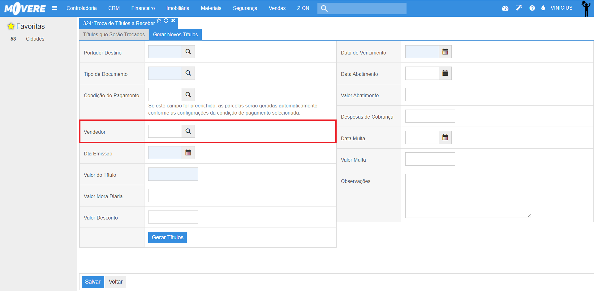 Sim. O sistema permite que, através do preenchimento do campo "Vendedor", localizado abaixo do campo "Condição de Pagamento" (vide imagens abaixo), o vendedor seja cadastrado nos títulos gerados a partir da troca, com ou sem condição de pagamento informada.