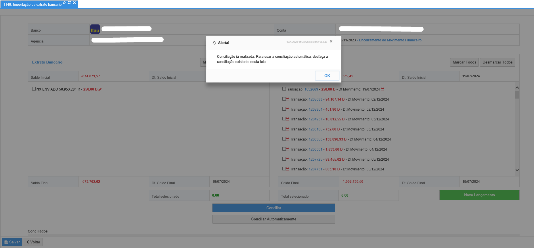 Observação: para usar este recurso, não pode haver nenhuma conciliação já registrada. Caso haja, será exibido o seguinte alerta: 'Conciliação já realizada. Para usar a conciliação automática, desfaça a conciliação existente nesta tela.'