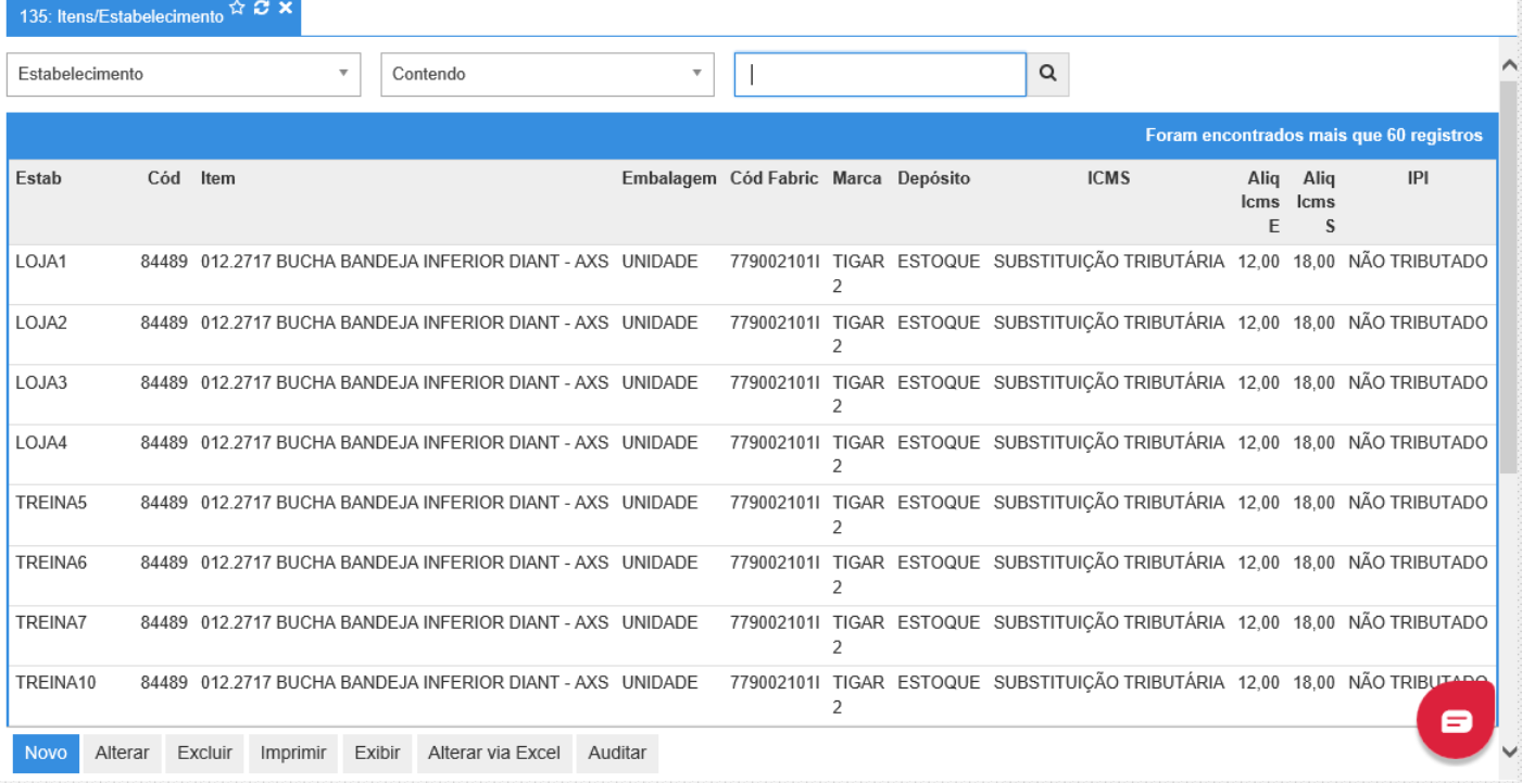 Ao clicar em cima do estoque de similares de um item é exibida uma sub-tela mostrando uma grade com as informações dos itens similares.