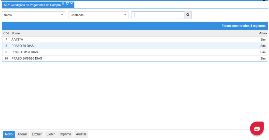 - Materiais > Cadastros > Condições de Pagamento de compra