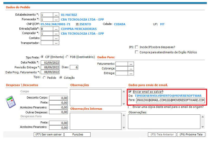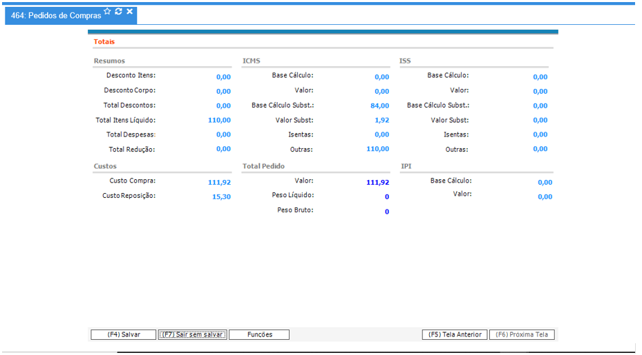 Já na última tela iremos confirmar os valores tratados e salvar as informações para que este pedido de compra seja inserido na grade de pedidos: