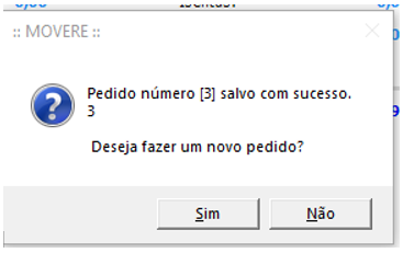 Ao salvar esta operação o sistema informa o número do pedido e pergunta se deseja cadastrar outro pedido: