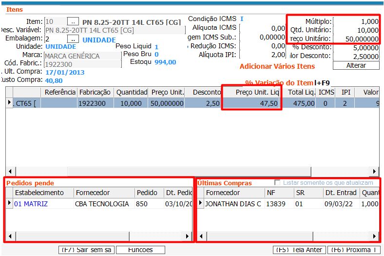 Veja que nesta tela é possível informar a quantidade a ser comprada o valor unitário, as ultimas compras e os pedidos pendentes.