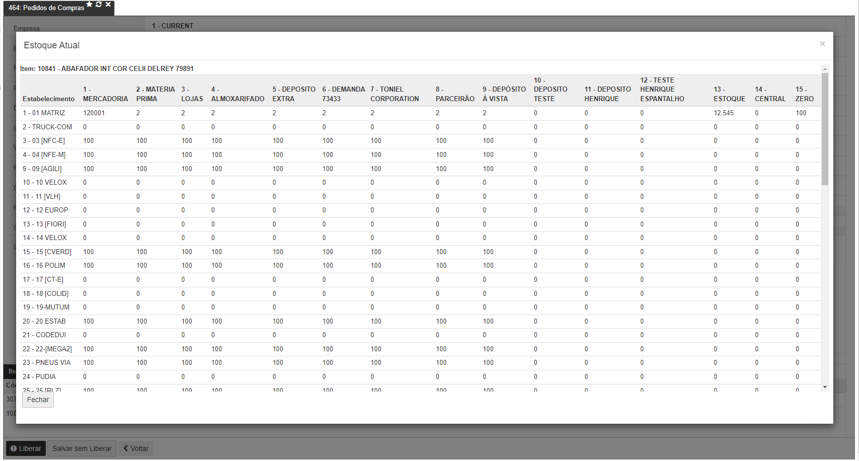 Ao clicar em cima do estoque atual de um item é exibida uma sub-tela mostrando o estoque do item em todos os depositos de todos os estabelecimentos em uma grade.