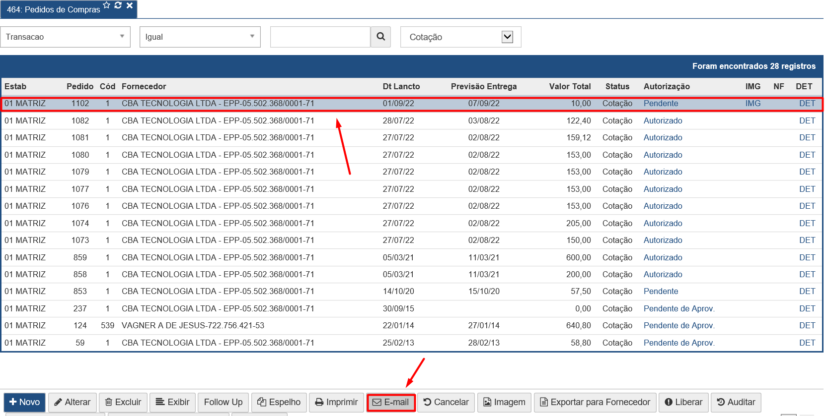 A rotina possui o direito chamado E-mail, para fazer uso desse direito, basta selecionar um pedido ou cotação da grade principal da rotina e pressionar o direito E-mail, como na imagem a seguir:
