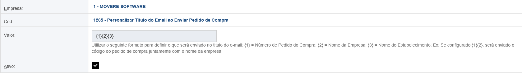 Também é possível fazer a seguinte configuração de apenas 1 ou 2 campos no parametro, ex: {1}{2} para que seja adicionado apenas o Código do Pedido de Compra + o nome da Empresa