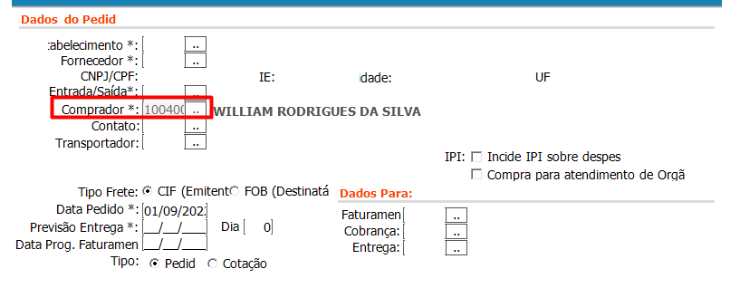 A rotina [R464 - Pedidos de Compras] possui o direito "Permite Alterar Comprador", que pode ser configurado na rotina [R697 - Liberação Rotina por Usuário], caso o usuário não possua esse direito e possua cadastro de comprador na [R465 - Compradores] o campo "Comprador" virá preenchido com código bloqueado e não permitirá a alteração conforme imagem abaixo: