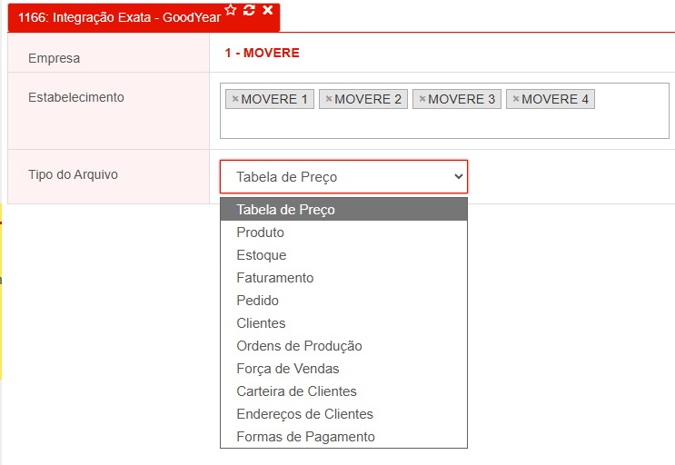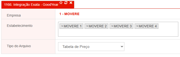 A rotina [R1166 - Integração Exata - GoodYear] é responsável pela integração com a GoodYear por meio da exportação de arquivo .json. Atualmente no sistema MOVERE, encontra-se disponível a exportação de: