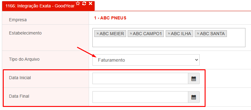 A rotina utiliza automaticamente as configurações previamente cadastradas na rotina Configuração da Integração Goodyear, carregando também os estabelecimentos na tela de envio manual.