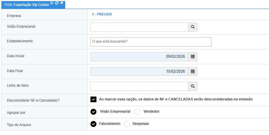 Ao abrir a torina [R1124 - Exportação Vip Custos] a tela exibida será a seguinte: