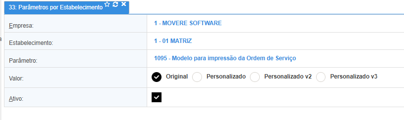 Também é possível ajustar o modelo de impressão através da rotina [R33 - Parâmetros por estabelecimentos], por meio do parâmetro [P1095 - Modelo para Impressão de Ordem de Serviço].