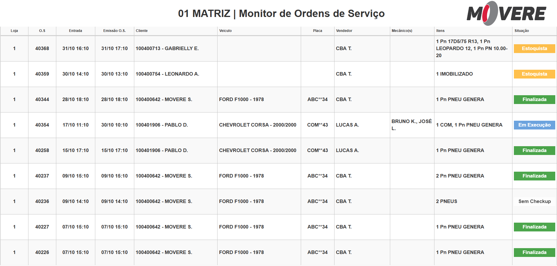 No monitor será apresentado o número da Ordem de Serviço, data e hora de entrada, data e hora de emissão da O.S., cliente, veiculo, placa, vendedor, mecânico, itens e situação.