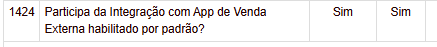 Na tela de parametrizações compartilhadas da R11 - Fast Checkup é possível ativar o P1424 - Participa da Integração com App de Venda Externa por padrão?