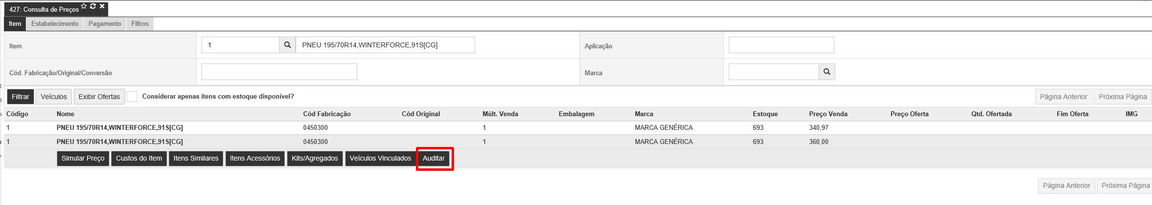 Para acessar o Auditar do item realize o filtrado na rotina [R427 - Consulta de Preços] e caso usuário possua acesso será exibido conforme imagem a baixo