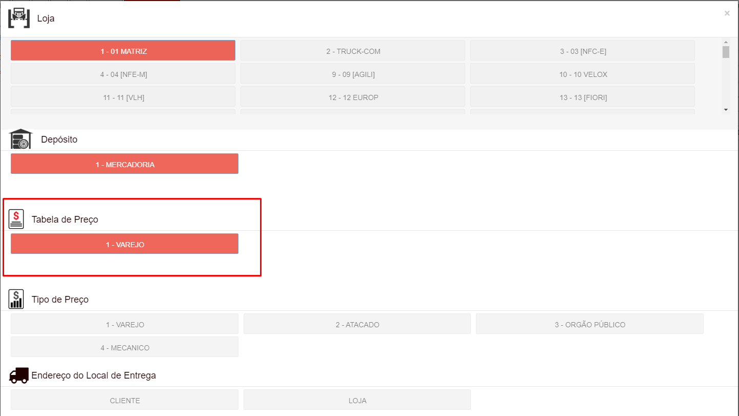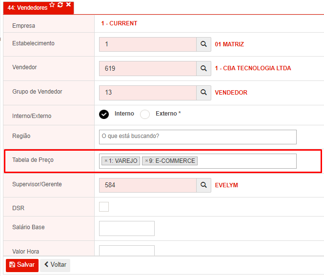 Atenção!: Quando o usuário não possuir vendedor [R44] associado ao seu cadastro de cliente [R43], Ou quando o vendedor não contem o preenchimento do campo "Tabela de Preço" o uso das tabelas de preço continuam disponíveis sem restrições. |