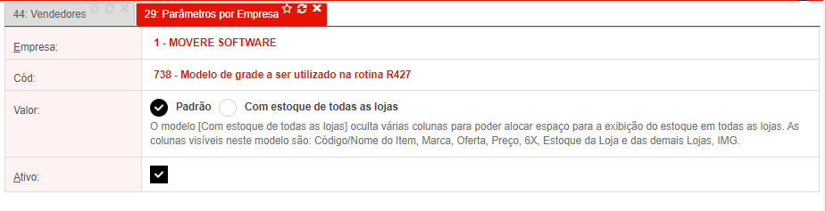 Existe outros parâmetros destinados a tabela de preço, para a empresa que utiliza o modelo "[P738] Com estoque de todas as lojas" a rotina dispõe de uma tela de configurações e nela é possível configurar a exibição de preços por tabela de preço como demonstrado abaixo: