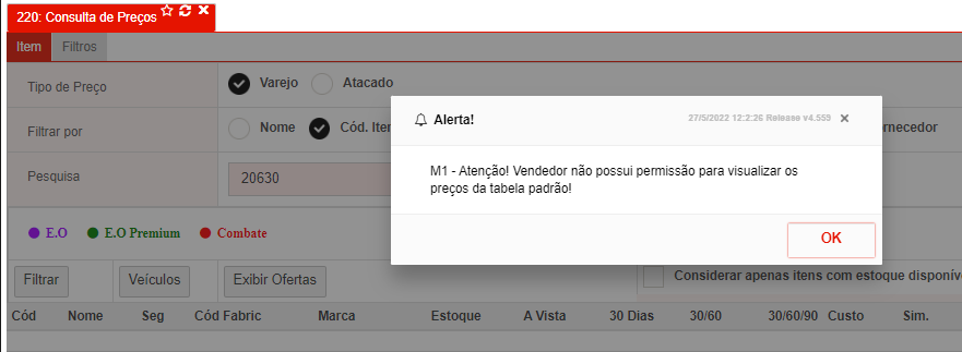 A rotina [R220 - Consulta de Preços] trabalha apenas com a tabela de preço padrão definida no parâmetro por estabelecimento [P3 - Tabela de Preço Padrão], dessa forma exibira apenas resultados caso o vendedor possuir permissão para visualização da tabela de preço configurada.