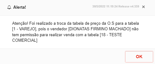 Caso o cliente possua uma tabela padrão configurada no cadastro da [43 - Clientes] e o vendedor não tenha configurado permissão na tabela, será selecionado a primeira tabela permitida para o vendedor e exibido uma mensagem notificando sobre a troca da tabela de preço.