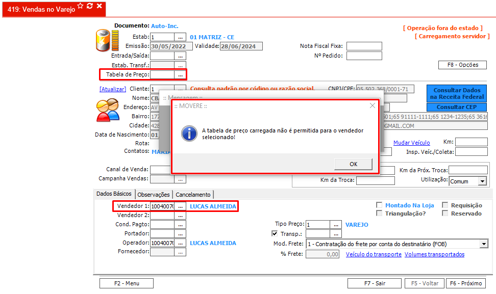 Caso a tabela de preço padrão do cliente não for permitida para o vendedor selecionado, será apresentada uma mensagem d, onde o usuário deverá preencher novamente e o campo "Tabela de Preço" com uma tabela de preço permitida ao vendedor conforme a configuração presente na [R44 - Vendedores].