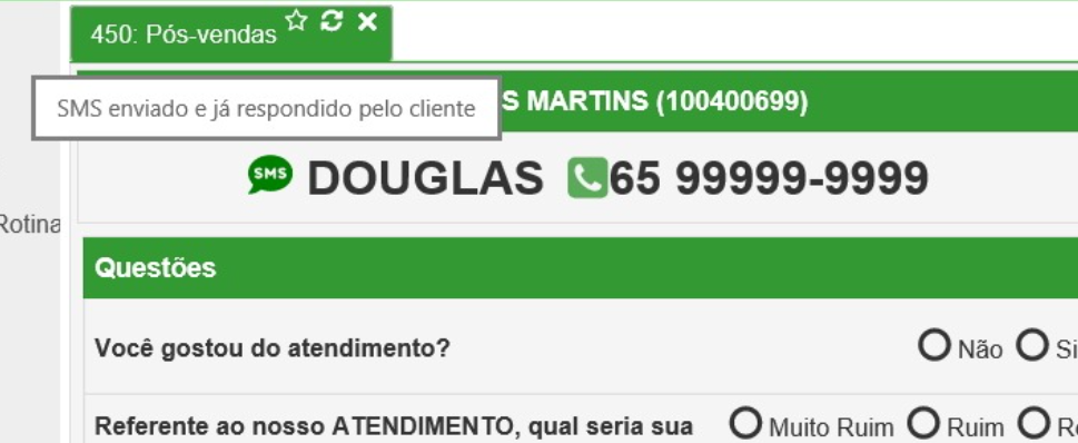 Quando o SMS já foi enviado, mas o cliente ainda não respondeu a pesquisa, o ícone de SMS é mostrado, em cor vermelha, ao lado do nome do cliente: