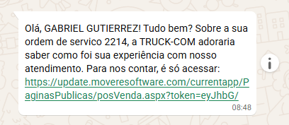 Obs: como o link de avaliação é enviado via SMS, deve ser usado um encurtador de URL para que o link não ultrapasse 30 caracteres.
