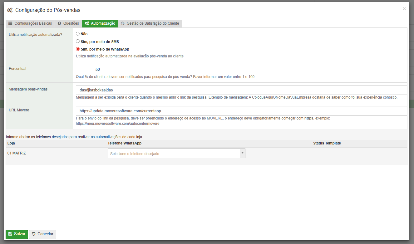 Após selecionar o telefone desejado e clicar em Salvar, será criado automaticamente um template no ComuniCar responsável pelo envio da avaliação de pós-venda.