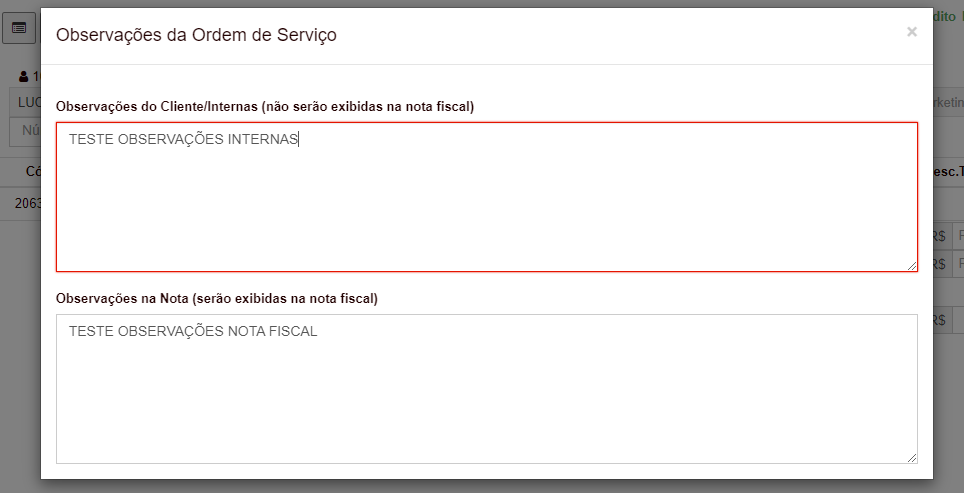 | Atenção: As observações internas podem ser impressas na Cotação/O.S quando o parâmetro por empresa [P869 - Observação para impressão na Ordem de Serviço] estiver com a opção "Observações Internas (não serão exibidas na nota fiscal)" ou "Todas" ativa. |
