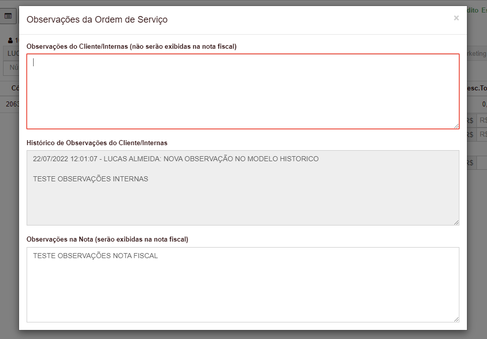Quando desativado o direito, o usuário poderá incluir novas observações internas no modelo histórico como no exemplo abaixo: