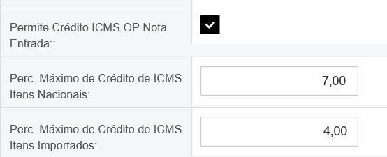 Para configurar o limite de crédito, na [R52 - Estados] ou [R288 - Estabelecimento], o campo [Permite crédito ICMS OP nota entrada] deve ser marcado e os campos [Perc. Máximo de Crédito de ICMS Itens Nacionais] e [Perc. Máximo de Crédito de ICMS Itens Importados] devem ser preenchidos com as respectivas porcentagens de crédito para os itens nacionais e os itens importados.