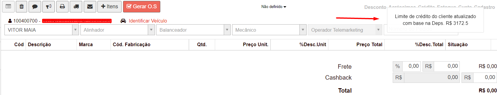 Após definir o cliente da O.S na R11, caso o parâmetro [P1263 - Utiliza integração e análise de Crédito DepsNet?] esteja habilitado, a consulta de crédito do cliente será feita integrada ao portal DepsNet.