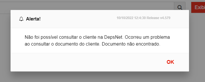 Em casos de a consulta não encontrar dados relacionado ao CPF/CNPJ buscado, será informado a seguinte mensagem. Se isto ocorrer, deve-se verificar o documento informado no cadastro do cliente.