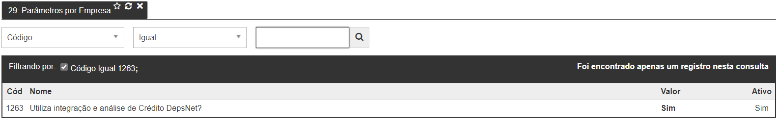 Para utilizar essa funcionalidade primeiramente deve-se habilitar o parâmetro por empresa [P1263 - Utiliza integração e análise de Crédito DepsNet?]