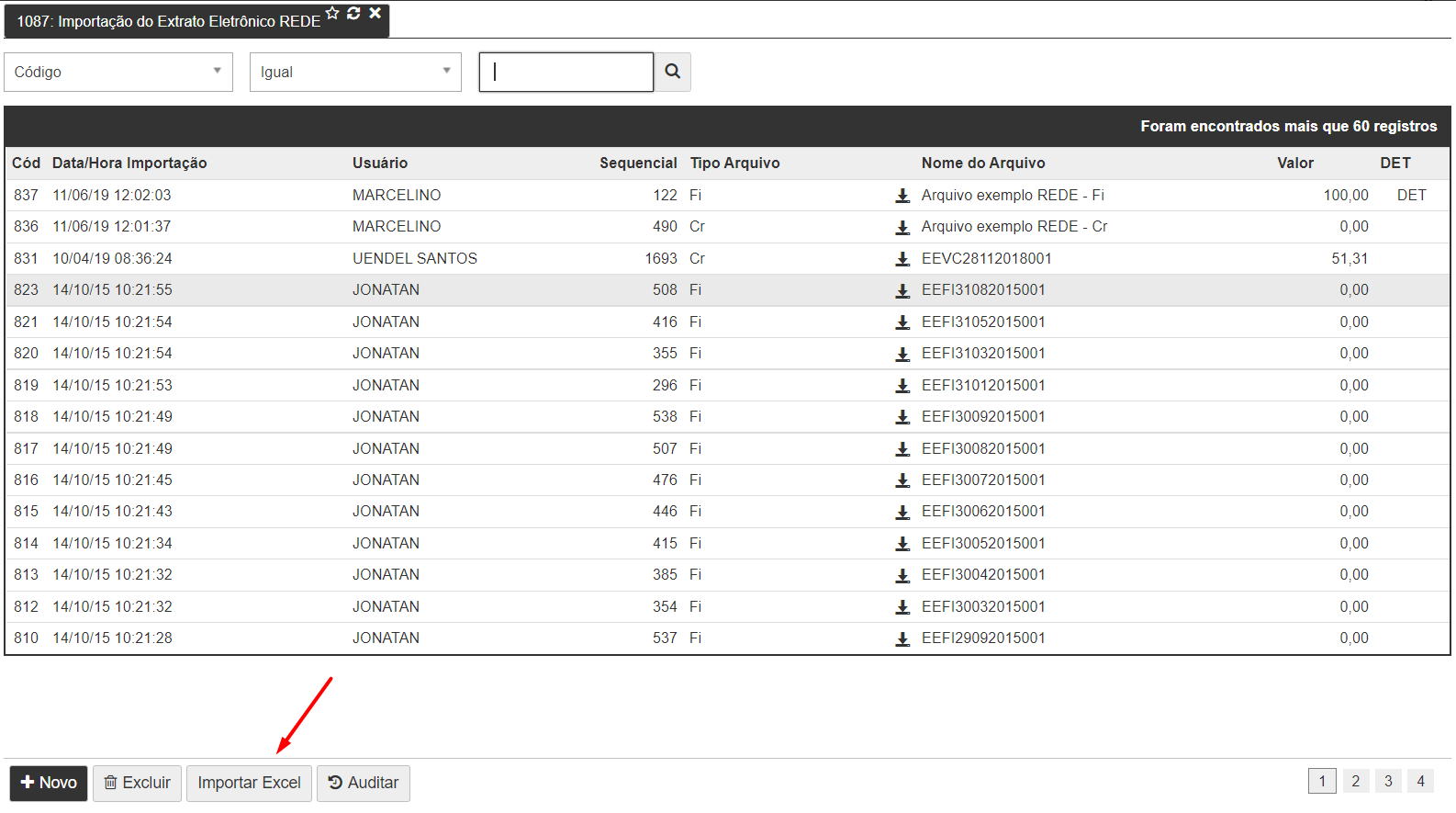 A partir da versão v4.581 do MOVERE, foi adicionado o direito Importar Excel a rotina [R1087 - Importação do extrato eletrônico REDE].