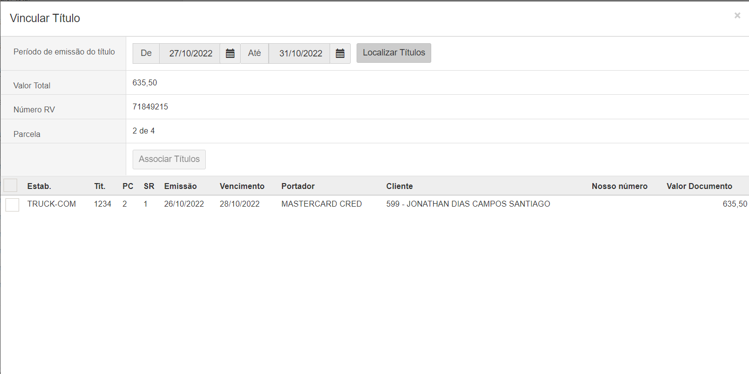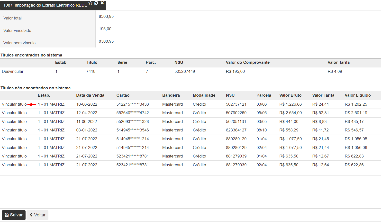 Após a importação da planilha ser feita, a localização dos títulos é realizada automaticamente buscando os títulos através do código NSU/ como NossoNumero, e pela parcela referente ao comprovante.