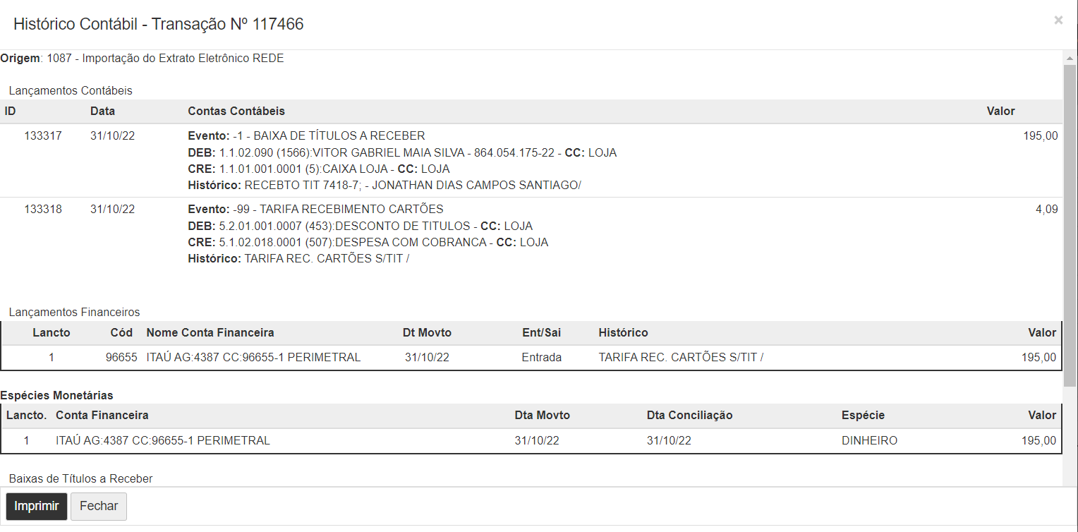 Após realizar todos os vínculos necessários, basta apenas salvar a importação e todo processo de Liquidação e Contabilização será feito. No DET, serão apresentados os Movimentos Financeiros, Baixas, e Lançamentos contábeis gerados durante a transação da importação.